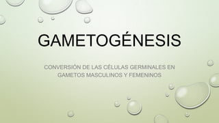 Este documento describe los procesos de gametogénesis, que incluyen la ovogénesis y la espermatogénesis. La ovogénesis es la formación y maduración del óvulo en la corteza ovárica a través de etapas como folículo primordial, primario, secundario y maduro. La espermatogénesis es el desarrollo de los gametos masculinos, los espermatozoides, en el epitelio de los túbulos seminíferos a través de varias fases. La unión de los gametos, el