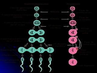La meiosis genera células con la mitad de la dotación cromosómica a través de dos divisiones celulares: la meiosis I o reduccional y la meiosis II o ecuacional. La gametogénesis consiste en la formación de los gametos, espermatozoides u ovocitos, a través de la espermatogénesis en los testículos y la ovogénesis en los ovarios, procesos que involucran la meiosis y dan como resultado células haploides a partir de células madre diploides.