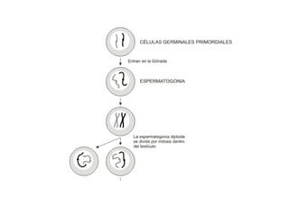 Este documento describe los conceptos básicos de la meiosis y la gametogénesis femenina y masculina. Explica que la meiosis ocurre cuando se forman los gametos y conduce a la formación de células haploides. Luego describe el proceso de espermatogénesis, que incluye la transformación de las espermatogonias en espermatozoides a través de la meiosis en aproximadamente 74 días, y el proceso de ovogénesis, que implica la transformación de las ovogonias en óvulos a través de la meiosis. Finalmente,