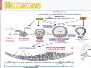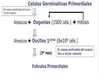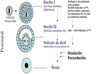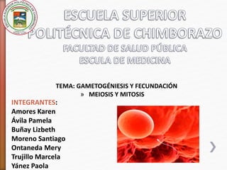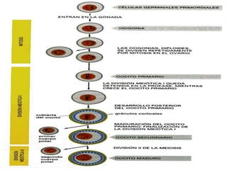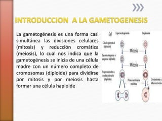 La gametogénesis y la fecundación implican procesos de división celular como la meiosis y la mitosis. La gametogénesis comienza con una célula diploide que se divide por mitosis y meiosis para formar células haploides. La fecundación ocurre cuando un óvulo y un espermatozoide se unen, formando un cigoto diploide que se divide por mitosis para desarrollarse en un embrión.