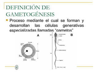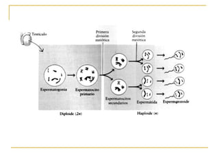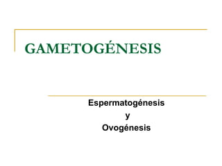 El documento describe los procesos de gametogénesis en humanos. La gametogénesis incluye la espermatogénesis y la ovogénesis. La espermatogénesis ocurre en los testículos y produce espermatozoides a través de la meiosis. La ovogénesis ocurre en los ovarios y produce óvulos a través de la meiosis. Ambos procesos comienzan con células germinales diploides que se dividen para formar gametos haploides a través de la meiosis.