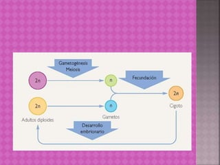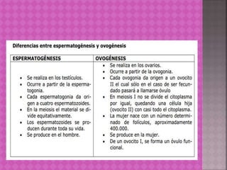 La gametogénesis es la formación de gametos mediante la meiosis, reduciendo el número de cromosomas a la mitad. En los humanos, la espermatogénesis produce espermatozoides en los testículos, mientras que la ovogénesis produce óvulos en los ovarios. Ambos procesos involucran dos divisiones meióticas que separan los cromosomas homologos y hermanos. Mientras los espermatozoides son pequeños, móviles y numerosos, los óvulos son grandes, inmóviles y menos numerosos.