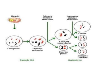 El documento describe los procesos de espermatogénesis y ovogénesis. La espermatogénesis es la formación de espermatozoides a partir de células germinales en los testículos e involucra proliferación, crecimiento y maduración. La ovogénesis es la formación de óvulos a partir de células germinales en los ovarios e igualmente involucra proliferación, crecimiento y maduración. Ambos procesos reducen el número de cromosomas de las células a través de la meiosis para formar gametos