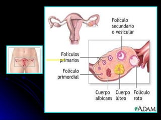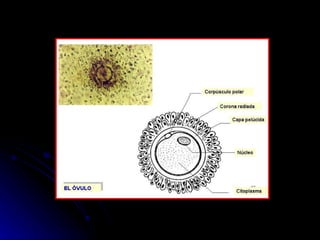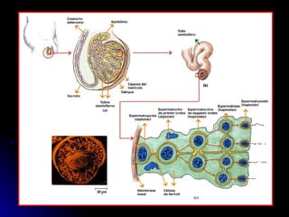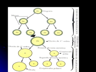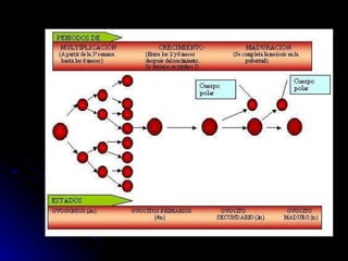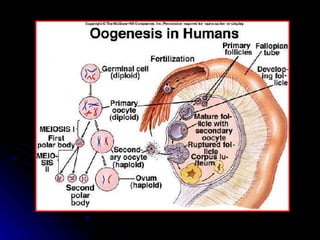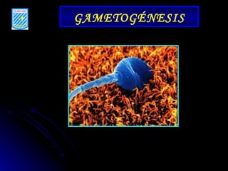 La gametogénesis es el proceso de formación de gametos a través de la meiosis. Incluye la espermatogénesis en los testículos y la ovogénesis en los ovarios, donde las células germinales diploides se dividen para formar gametos haploides. La fecundación ocurre cuando los gametos masculino y femenino se unen para formar un cigoto.