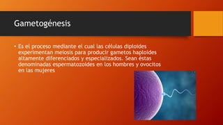 La gametogénesis es el proceso mediante el cual las células diploides experimentan meiosis para producir gametos haploides altamente diferenciados y especializados, como los espermatozoides y los ovocitos. La espermatogénesis y la ovogénesis son los procesos específicos de producción de gametos masculinos y femeninos, respectivamente, que involucran división celular y diferenciación a lo largo de varias etapas hasta alcanzar la maduración de los gametos.