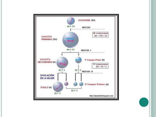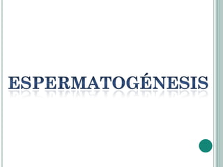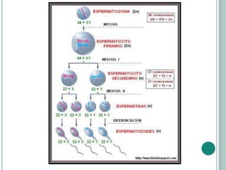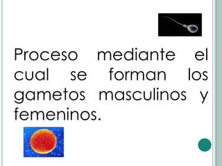 El documento describe los procesos de gametogénesis, específicamente la espermatogénesis y la ovogénesis. La espermatogénesis implica la división celular y maduración de las células germinales masculinas en los testículos para formar los espermatozoides móviles. La ovogénesis implica la división celular y maduración de las células germinales femeninas en los ovarios para formar los grandes pero poco móviles óvulos.