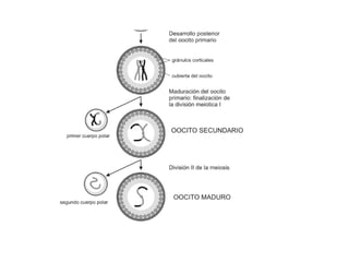 Este documento describe los conceptos básicos de la meiosis y la gametogénesis femenina y masculina. Explica que la meiosis ocurre cuando se forman los gametos y conduce a la formación de células haploides. Luego describe el proceso de espermatogénesis, que incluye la transformación de las espermatogonias en espermatozoides a través de la meiosis en aproximadamente 74 días, y el proceso de ovogénesis, que implica la transformación de las ovogonias en óvulos a través de la meiosis. Finalmente,