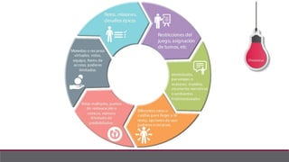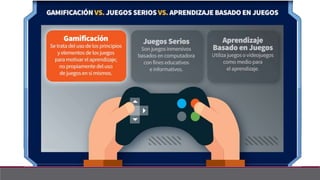 El documento define la gamificación como la aplicación de elementos y principios de los juegos en contextos no lúdicos para modificar comportamientos e incrementar la motivación. Explica que la gamificación incorpora mecánicas de juegos como puntos, recompensas e incentivos en la educación, a diferencia de los juegos serios que son juegos con fines educativos o de aprendizaje basado en juegos que usa juegos existentes para enseñar.