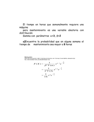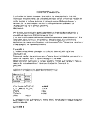 La distribución gamma se utiliza para modelar el tiempo hasta que ocurren ciertos eventos. Si el número de eventos sigue una distribución de Poisson, el tiempo hasta el enésimo evento sigue una distribución gamma. Esta distribución se usa en fiabilidad, mantenimiento y tiempos de espera. Los ejemplos incluyen el tiempo de vida útil y el tiempo hasta la llegada del segundo paciente a una consulta médica.