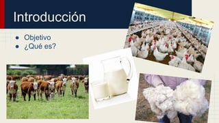 El documento describe los diferentes tipos de ganadería según la especie de ganado y la forma en que se explota, incluyendo ganadería bovina, porcina, ovina, caprina, equina, avícola y acuicultura. También resume la distribución de la ganadería en Argentina y los números económicos de la industria ganadera en el país, la cual representa alrededor del 6% del PBI argentino.