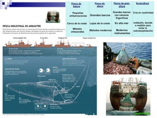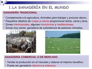 Este documento resume la ganadería y la pesca a nivel mundial. Describe los tipos de ganadería tradicional y comercial, así como los métodos de cría y alimentación del ganado. También explica los tipos de pesca tradicional e industrial, las principales zonas pesqueras y los problemas de la sobrepesca y la falta de caladeros. Finalmente, destaca la necesidad de una explotación sostenible de los recursos marinos.