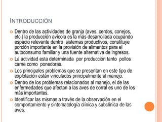 La colibacilosis es una enfermedad causada por variedades de E. coli que afecta principalmente a aves jóvenes, manifestándose con síntomas como fiebre, plumas desordenadas y diarrea. Se transmite a través del sistema respiratorio y gastrointestinal. Para prevenirla, es importante mantener buenas condiciones sanitarias en los galpones, desinfectar equipos, y aplicar vacunación y antibióticos para controlar brotes.