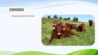 La raza Salers proviene del suroeste de Francia. Se caracteriza por su pelo largo y rizado de color rojo oscuro o negro, y su piel café rosada. Es una raza que puede caminar grandes distancias en terrenos difíciles y soportar variaciones de temperatura. Las vacas Salers tienen crías pequeñas, son muy fértiles y poseen buena habilidad materna. Esta raza también se caracteriza por su alta producción lechera, longevidad y resistencia a enfermedades.