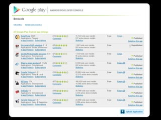 El documento detalla el proceso de desarrollo y monetización de aplicaciones móviles, abarcando aspectos como la identificación del público objetivo, modelos de negocio y estrategias de promoción. Se analiza la compatibilidad de las aplicaciones con diferentes versiones de Android y se presentan ejemplos de éxito en la utilización de publicidad para generar ingresos. Además, se incluyen recomendaciones sobre cómo utilizar herramientas como Google AdMob y estadísticas relevantes para los desarrolladores.