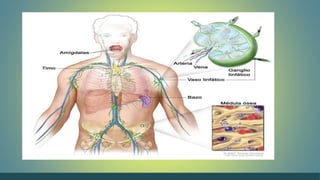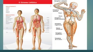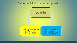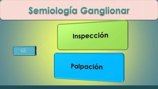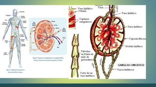 El documento describe el sistema linfático y los ganglios linfáticos. Explica que la linfa circula a través de los vasos linfáticos y ganglios linfáticos, los cuales filtran la linfa y producen glóbulos blancos. Los ganglios linfáticos se encuentran en varias partes del cuerpo y aumentan de tamaño durante las infecciones para combatir patógenos. El documento también detalla la localización y funciones específicas de diferentes ganglios linfáticos.