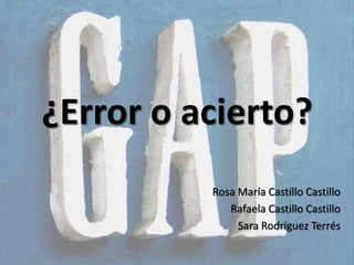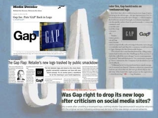 El documento habla sobre el logo de la marca Gap. En 1969, Donald Fisher fundó Gap en California y la empresa creció a 15,000 empleados y 3,000 tiendas a nivel mundial. Después de 20 años con el mismo logo, los directivos decidieron cambiar la imagen pero no anticiparon la inmediata reacción negativa del nuevo logo por parte de los clientes.