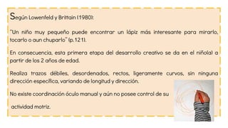 El documento describe las características de la etapa de garabateo descontrolado en el desarrollo del dibujo infantil. En esta etapa, que ocurre alrededor de los 2 años de edad, los niños realizan trazos débiles, desordenados y sin coordinación manual, variando en longitud y dirección. Todavía no tienen control visual sobre su mano y se mueven desde el hombro. El garabateo en esta etapa no tiene intención representativa sino que se basa en el desarrollo físico y es simplemente placentero