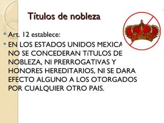 El documento prohíbe los títulos de nobleza y honores hereditarios en México. Establece la igualdad de todos los individuos ante la ley, sin distinciones de clase social. Asimismo, proscribe el reconocimiento de títulos nobiliarios otorgados por otros países.