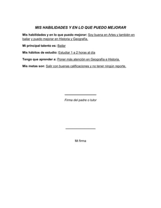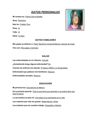 Este documento contiene información personal de Fátima García Badillo, una niña de 12 años de edad nacida en Puebla, México. Detalla sus datos personales como nombre, edad, peso y estatura, así como datos familiares como la ocupación de sus padres y con quién vive. También incluye información sobre su salud, educación primaria y secundaria, sus habilidades en artes y baile, así como sus metas de salir bien en la escuela sin reportes.