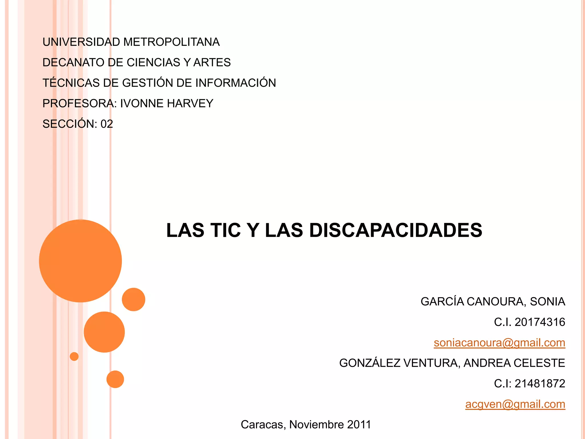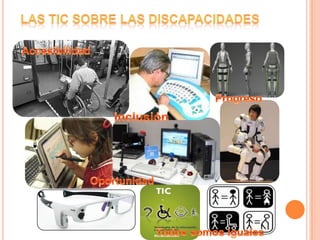 El documento presenta un resumen de un trabajo de investigación sobre el uso de las Tecnologías de la Información y la Comunicación (TIC) para ayudar a personas con discapacidades. El trabajo analiza cómo las TIC pueden apoyar a personas con discapacidades cognitivas, sensoriales y físicas, permitiéndoles superar barreras y participar plenamente en la sociedad. Las autoras agradecen a su profesora e institución por la oportunidad de estudiar este importante tema.