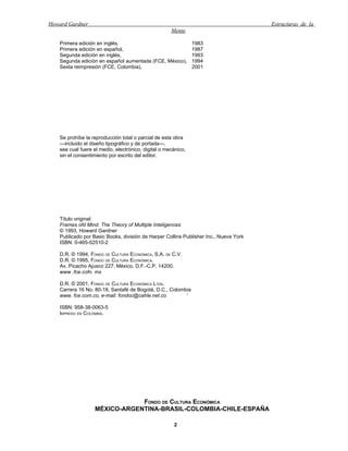 Este documento presenta la teoría de las inteligencias múltiples de Howard Gardner. Propone que la inteligencia no es una capacidad única y general, sino que existen múltiples inteligencias como la lingüística, lógico-matemática, espacial, musical, cinestésica y personal. El documento también resume la recepción y críticas de la teoría en los últimos 10 años desde su publicación original.