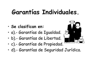 Este documento resume las principales garantías individuales establecidas en la Constitución Mexicana. Se clasifican en garantías de igualdad, libertad, propiedad y seguridad jurídica. Algunas de las garantías más importantes son la prohibición de la discriminación, esclavitud y monopolios; y los derechos a la libre expresión, trabajo, asociación, religión y propiedad privada. También establece límites al poder del Estado para proteger los derechos de los individuos.