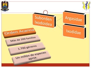 Este documento describe las características de las garrapatas y su importancia médica y veterinaria. Describe las dos familias principales de garrapatas, Ixodidae y Argasidae, incluyendo sus ciclos de vida y especies más relevantes. También explica cómo las garrapatas transmiten enfermedades como la fiebre botonosa y la enfermedad de Lyme, y los métodos para controlarlas e tratar sus picaduras.