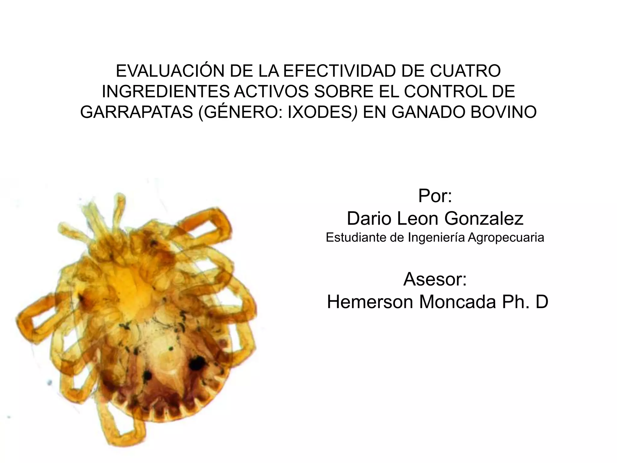 El documento evalúa la efectividad de cuatro productos garrapaticidas en el control de garrapatas en ganado bovino. Se asignaron cuatro lotes de animales a cada producto y se midió el nivel de infestación antes y después de las aplicaciones cada 21 días. Los resultados mostraron una reducción en los niveles de infestación para todos los productos.