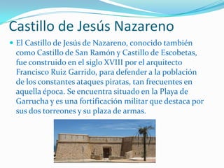 2) En el siglo XVIII se construyó el Castillo de Jesús Nazareno para defender la población de los ataques piratas.