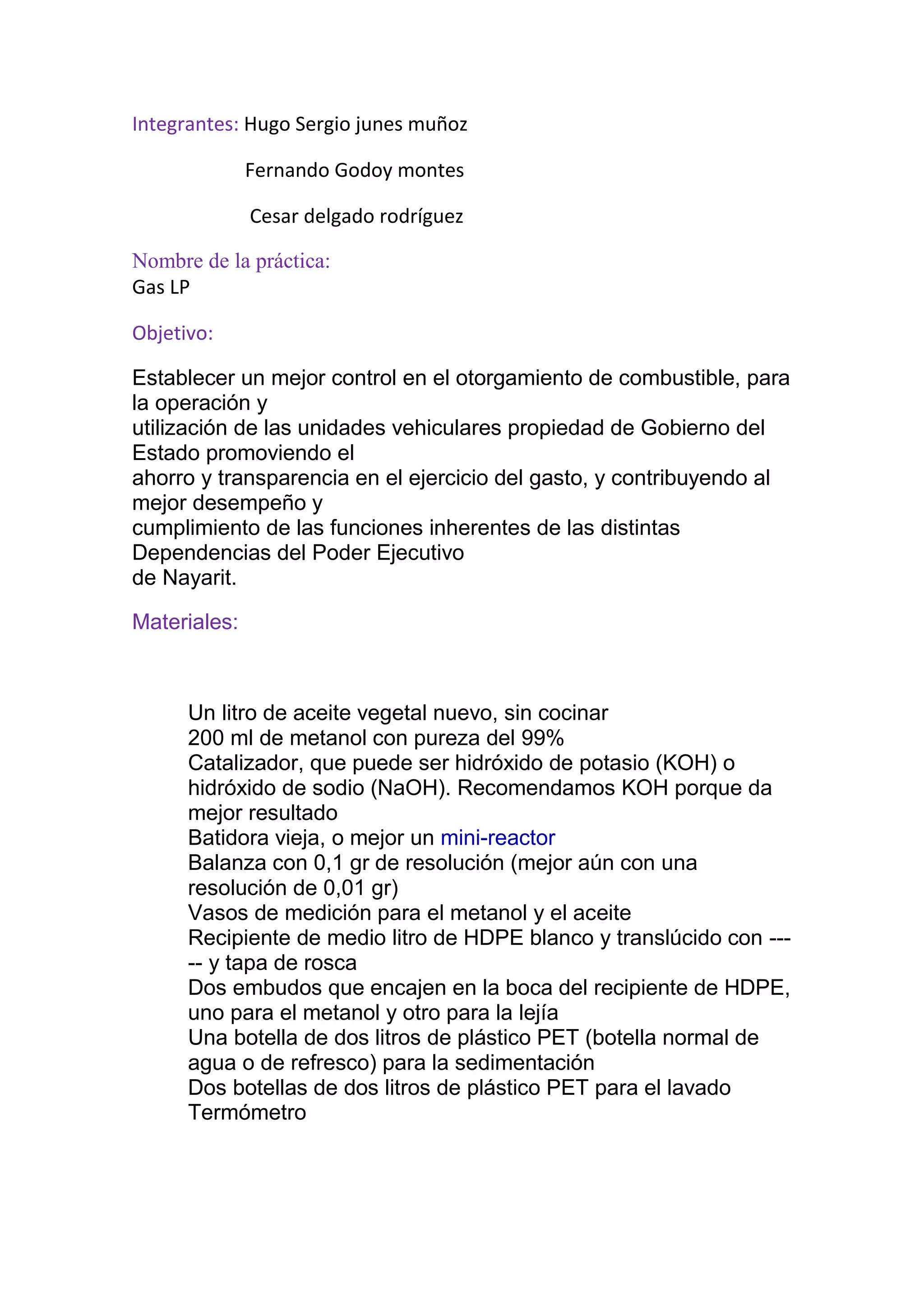 El documento describe un proyecto para establecer un mejor control en el suministro de gas LP a vehículos del gobierno de Nayarit. El objetivo es promover el ahorro y transparencia en el gasto de combustible. Se explica brevemente el proceso de producción del gas LP y sus usos principales como combustible para automóviles, refinerías y uso doméstico.
