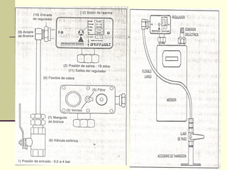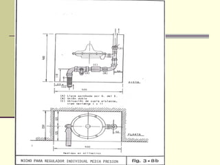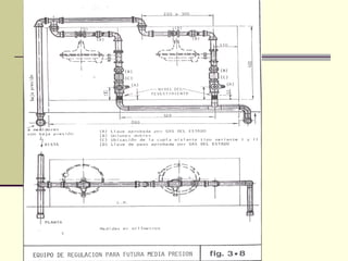 El documento describe la industria del gas natural en Argentina. Se privatizó la empresa estatal Gas del Estado en 1992 y se creó el ente regulador ENARGAS. El gas se extrae de yacimientos en las cuencas del noreste, Neuquina y Austral, y se transporta a través de gasoductos hasta las ciudades, donde es distribuido por empresas como MetroGas. El esquema muestra cómo llega el gas a las casas a través de la red de distribución de gas a media presión.