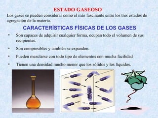 Este documento trata sobre los gases y sus propiedades físicas. Explica que los gases pueden adoptar cualquier forma, son compresibles y se expanden fácilmente. Además, presenta las leyes de Boyle, Charles y Gay-Lussac, las cuales describen la relación entre la presión, volumen y temperatura de los gases ideales. Finalmente, introduce la ecuación de estado de los gases ideales.