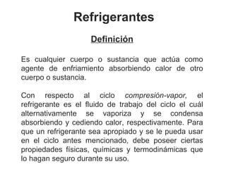 El documento proporciona información sobre refrigerantes, incluidas sus propiedades ideales, clasificaciones y ejemplos. Explica las diferencias entre refrigerantes puros, mezclas azeotrópicas y zeotrópicas. También incluye tablas que muestran refrigerantes recomendados para diferentes aplicaciones y equipos de refrigeración.