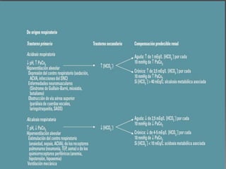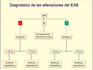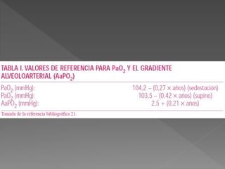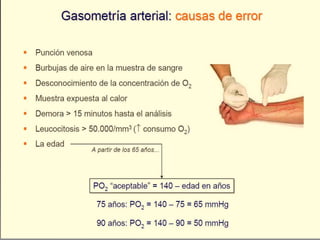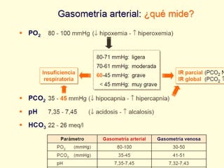 La gasometría mide los gases en los fluidos biológicos y es útil para evaluar el equilibrio ácido-base y la función respiratoria. Se toma una muestra de sangre arterial, venosa periférica o venosa central para medir la oxigenación, el intercambio de gases alveolo-capilar y el equilibrio ácido-base. La gasometría indica trastornos respiratorios graves, disnea, taquipnea, alteraciones de la conciencia, hemodinámicas o del potasio.