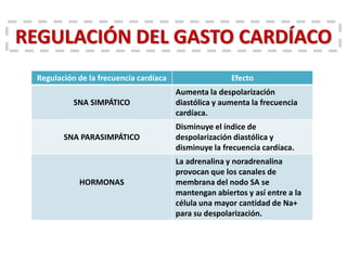 El gasto cardíaco es el volumen de sangre bombeado por minuto por cada ventrículo del corazón y se obtiene multiplicando la frecuencia cardíaca por el volumen sistólico. El sistema nervioso simpático aumenta la frecuencia cardíaca al incrementar la despolarización diastólica, mientras que el sistema nervioso parasimpático la disminuye. Las hormonas como la adrenalina y la noradrenalina mantienen abiertos los canales de membrana del nodo sinusal para permitir una mayor entrada de sodio y así aument