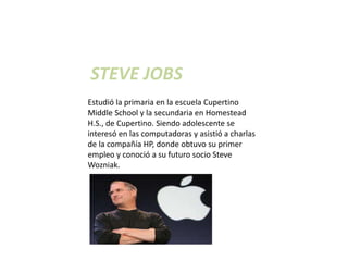 Steve Jobs nació en 1955 en San Francisco y fue adoptado. Se interesó en las computadoras desde joven y cofundó Apple Computer con Steve Wozniak en 1976. Lanzó el Macintosh en 1984 pero renunció a Apple en 1985. Fundó NeXT y Pixar y regresó a Apple como CEO en 1997. Murió en 2011.