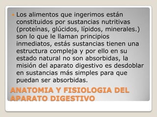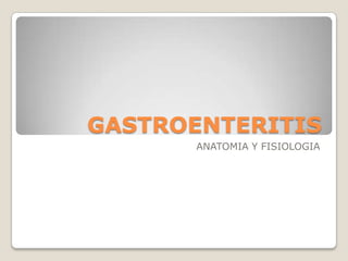 El documento describe la anatomía y fisiología del aparato digestivo humano, incluyendo una descripción de cada órgano del tubo digestivo, así como las glándulas anexas. Explica que la misión del aparato digestivo es recibir los alimentos, transformarlos químicamente para su absorción y proporcionar nutrientes al cuerpo. También brinda detalles sobre la gastroenteritis, incluyendo sus causas, signos y síntomas, y tratamiento.