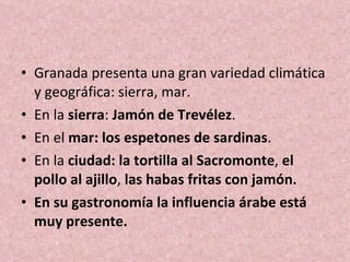 El documento describe la variedad gastronómica de Granada según su geografía y cultura. En las sierras se produce jamón de Trevélez, en el mar espetones de sardinas, y en la ciudad platos como tortilla de Sacromonte y pollo al ajillo. Platos típicos incluyen habas con jamón, la olla de San Antón en invierno, y la tortilla de Sacromonte. El documento también presenta varias rutas de tapeo por barrios como Albaicín, Realejo y aledaños a la catedral