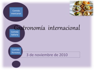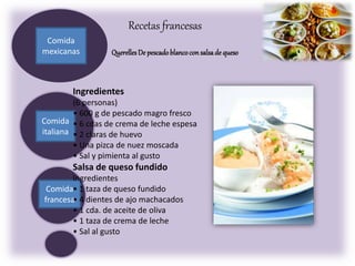 El documento presenta recetas de comida francesa, italiana y mexicana. La receta francesa describe cómo preparar quenelles de pescado blanco con salsa de queso fundido. La receta italiana es para una pizza a la marinera hecha con atún, mejillones, salsa de tomate y queso. La receta mexicana no incluye detalles.