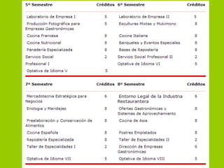 Este documento describe un plan de estudios de 10 semestres para la carrera de Gastronomía. Incluye prácticas profesionales en diferentes niveles como restaurantes, hospitales y escuelas. Los estudiantes pueden especializarse en cocina internacional o nacional. El plan de estudios se ofrece en la Universidad ICUM en Monterrey, México. Incluye información sobre becas y el proceso de admisión que considera exámenes, entrevistas y exámenes médicos.