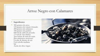 El primer documento presenta dos recetas: arroz negro con calamares, que incluye calamares, gambas y tinta de sepia; y lasaña de plátano y carne molida, con capas de plátano frito, carne y salsa boloñesa. El segundo documento contiene cuatro recetas breves: batido de melón y pera; consomé de camarones con calabacín y cebolla; y coctel atracción espumosa a base de champagne y jugo de mora.
