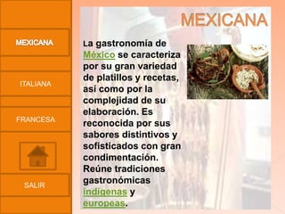 El documento describe brevemente las gastronomías de México, Italia y Francia. La gastronomía mexicana se caracteriza por su gran variedad de platillos y recetas que combinan tradiciones indígenas y europeas. La cocina italiana también es muy variada y refleja la diversidad cultural de sus regiones. Finalmente, la gastronomía francesa está considerada como una de las más importantes del mundo, caracterizada por su refinamiento y diversidad regional.