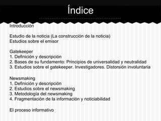 Este documento resume los conceptos clave de gatekeeper y newsmaking en el estudio del emisor. Explica que el gatekeeper decide qué noticias se transmiten basado en factores como el espacio, la audiencia y valores personales. Estudios encontraron distorsión involuntaria en la selección de noticias. El newsmaking se refiere al proceso de construcción de noticias teniendo en cuenta la lógica de la producción periodística. El documento también describe el proceso informativo de recogida, selección y presentación de noticias.