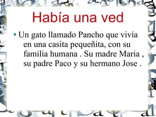Pancho era un gato que vivía con su familia humana. Un día, mientras esperaba a su amigo Jose para jugar, los dos pasaron la tarde jugando al pillapilla. Cuando su madre los llamó a cenar, cenaron y se fueron a dormir. A la mañana siguiente, desayunaron y continuaron divirtiéndose juntos el resto del día.