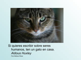 El documento habla brevemente sobre la historia de la domesticación del gato, que data de hace unos 9.000 años. Luego presenta citas de varios filósofos y escritores que destacan la sabiduría e inteligencia de los gatos, describiéndolos como seres espirituales superiores a los humanos o que siempre están razonando.