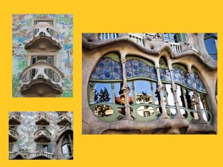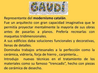 Antoni Gaudí era un arquitecto catalán del modernismo que prefería proyectar mentalmente y con maquetas tridimensionales sus obras antes de pasarlas a planos. Daba soluciones funcionales y decorativas a sus edificios, llenos de detalles, y dominaba trabajos artesanales como la cerámica, vidriería y carpintería. Introdujo nuevas técnicas como el "trencadis" hecho con piezas de cerámica de desecho. Algunas de sus obras más conocidas incluyen la Sagrada Famil
