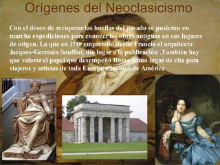 El documento habla sobre el Neoclasicismo en la escultura, arquitectura y pintura. El Neoclasicismo se originó con expediciones a sitios antiguos para conocer obras del pasado. En escultura se usaba mármol buscando belleza y perfección griega. En arquitectura se inspiró en órdenes griegos y elementos romanos. El pintor más importante fue Jacques Louis David, quien pintó escenas históricas y cuadros de contenido político al servicio de las ideas revolucionarias.