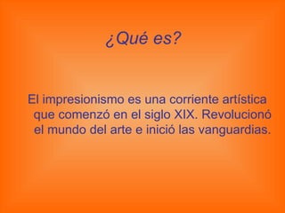 El documento resume el estilo artístico del impresionismo, que revolucionó el arte en el siglo XIX al plasmar escenas al aire libre y capturar sensaciones visuales a través de manchas de color. Detalla a algunos de los principales artistas impresionistas como Monet, Renoir y Degas. También presenta al escultor Auguste Rodin, conocido por obras como "El beso" y "El pensador", que renovó la escultura pública alejándose de la mimesis clásica.