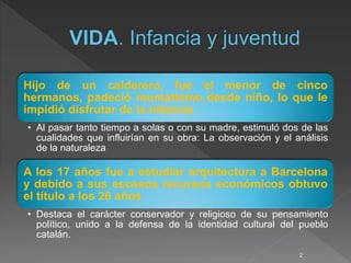 El documento describe la vida y obra del arquitecto catalán Antoni Gaudí. Nació en una familia humilde y padeció reumatismo de niño. Estudió arquitectura en Barcelona y se destacó por su defensa de la identidad cultural catalana. Su obra más conocida es la Sagrada Familia, en la que trabajó desde 1883 hasta su muerte en 1926. Gaudí es reconocido por su estilo modernista y por integrar la naturaleza en sus diseños arquitectónicos de manera innovadora.