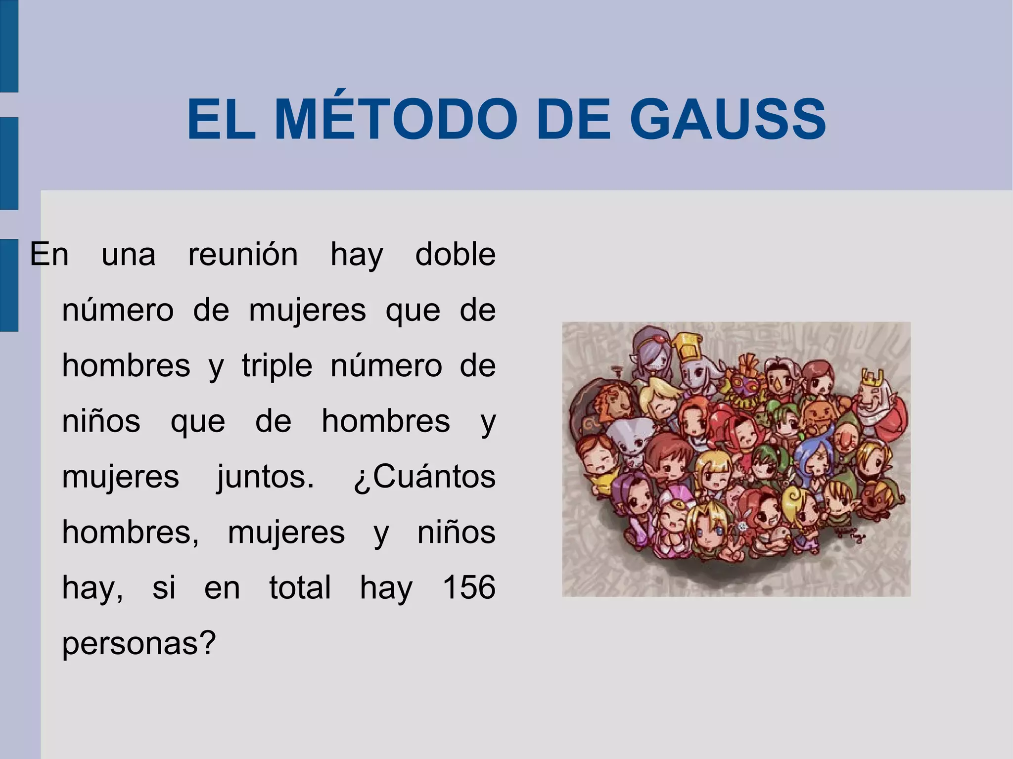 Este documento presenta un problema de sistemas de ecuaciones para determinar el número de hombres, mujeres y niños en una reunión donde hay el doble de mujeres que hombres, y el triple de niños que la suma de hombres y mujeres, si el total es 156 personas. Se plantean las ecuaciones, se resuelven paso a paso despejando las incógnitas, llegando a que hay 13 hombres, 26 mujeres y 117 niños.